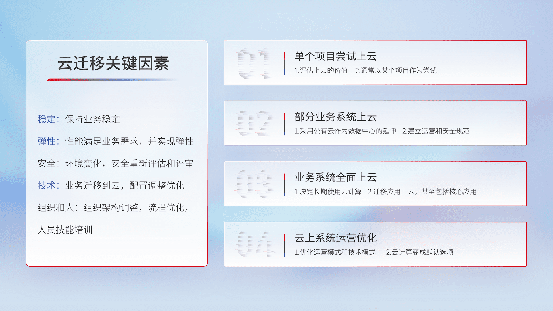 结合实际业务,,,,从规划设计、、云平台选型、、云原生改造、、、数据迁移、、集成交付,,迁移全过程为客户识别最佳上云路径,,,,做好风险识别管理,,设计网络架构、、身份权限、、安全审计合规、、、操作审计、、、、日志审计、、、监控告警策略、、、、多站点容灾设计等,,,,对云上基础设施进行整体规划,,,,提升IT治理水平,,以满足弹性、、、、高可用、、、高性能的需求。。