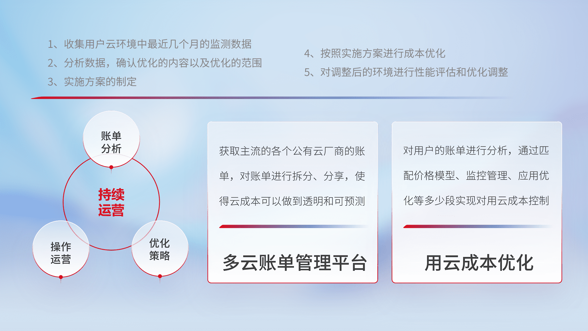 通过多云纳管,,,,以统一的资源数据模型把客户的云资源进行抽象和封装,,,进而实现对多云资源的统一操作,,,,保障云资源管理的可靠性、、稳定性与可用性。。。量身定制化运维内容,,,,配置、、开发运维、、、、补丁管理、、备份、、监控、、、认证和访问管理、、、、审计和日常巡检等,,,保障在用云过程中的可靠度,,,稳定度以及高可用率。。。。