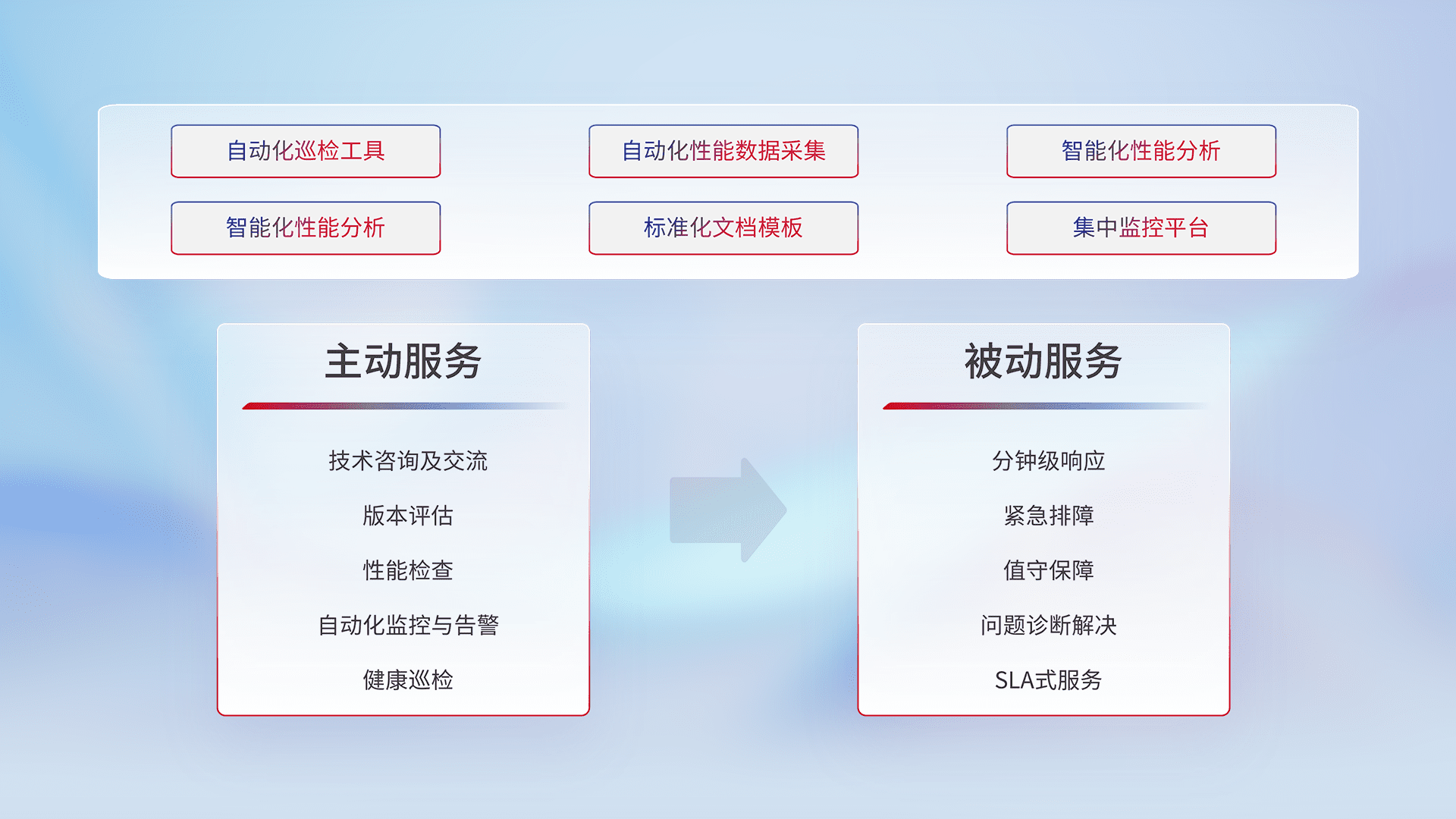 智能化工具和标准化文档,,保障服务质量,,提供主动服务(包含技术咨询、、、、版本评估、、、性能检查、、、、自动化监控与告警、、、健康巡检)和被动服务包含(分钟级响应、、、紧急排障、、值守保障、、、、问题诊断解决、、、SLA服务)。。。。